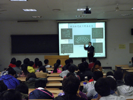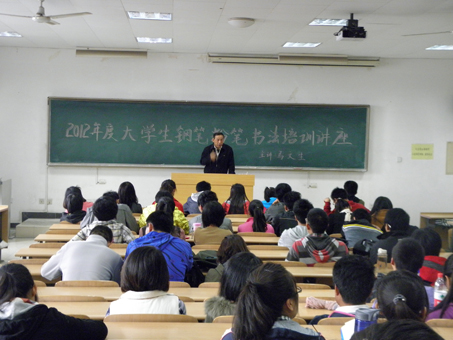 承办的2012年度大学生钢笔粉笔书法培训讲座在C楼206教室成功举办。天津市书法家协会会员、我校职工马卫生受邀担任此次培训的主讲教师,各学院参加钢笔粉笔书法比赛决赛的选手及书法爱好者们聆听了讲座。