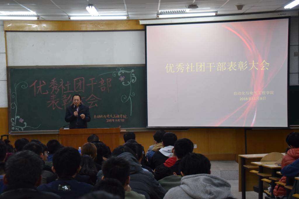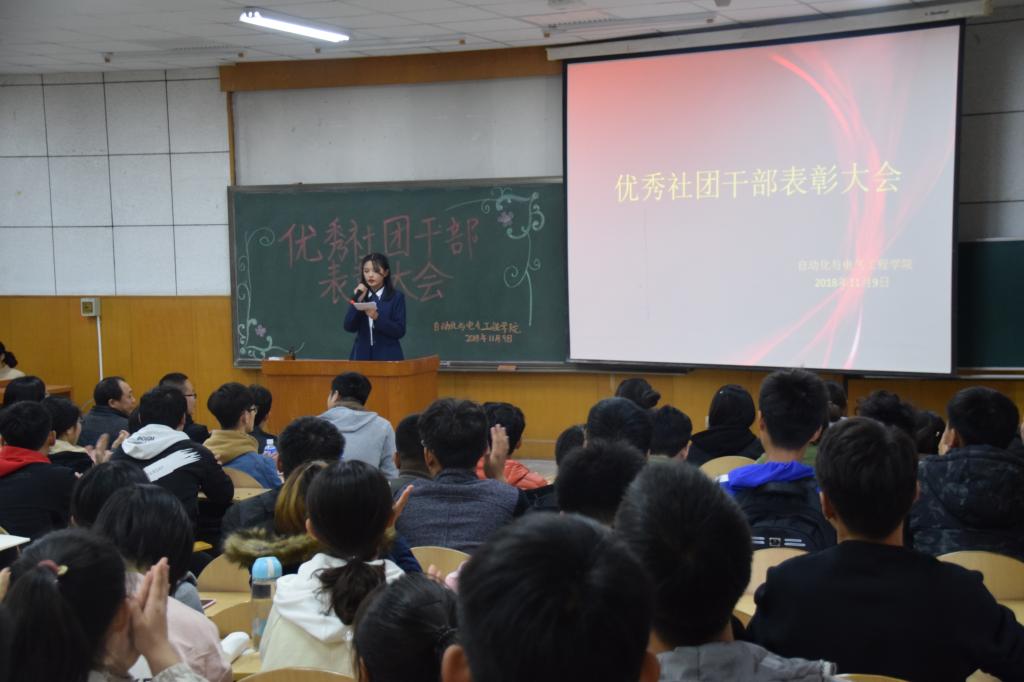 在阶教101举办优秀社团干部表彰大会。学院党委副书记李敏、团委书记仲伟邦、学生工作办公室主任郭丽芳、团委副书记王永亮、学院辅导员及全体社团干部参加了此次大会。