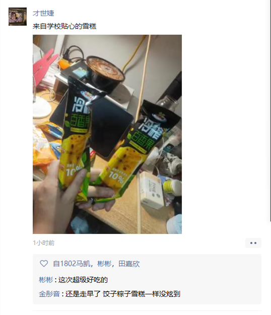 拿到冰棍的同学们,纷纷用手机拍照,通过朋友圈等方式表达感动、感谢之情。“端午佳节,炎炎夏日,不但收到了学校给的粽子,还收到了学院给我们的冰棍,吃到这些满载祝福的粽子和冰棍,感到十分暖心。”学院自2001班的苑琳说到。