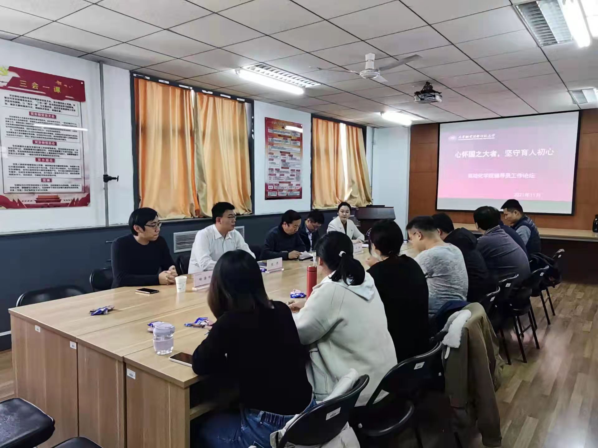 党委邀请高职部辅导员赵然、机械工程学院辅导员滕薇、王海、艺术学院辅导员白宗刚参加交流分享。此次参加辅导员工作论坛的有学院党委书记张世龙、学院团委书记贾旭、学院全体辅导员,在新疆支教的党委副书记李敏也通过腾讯会议线上参会。