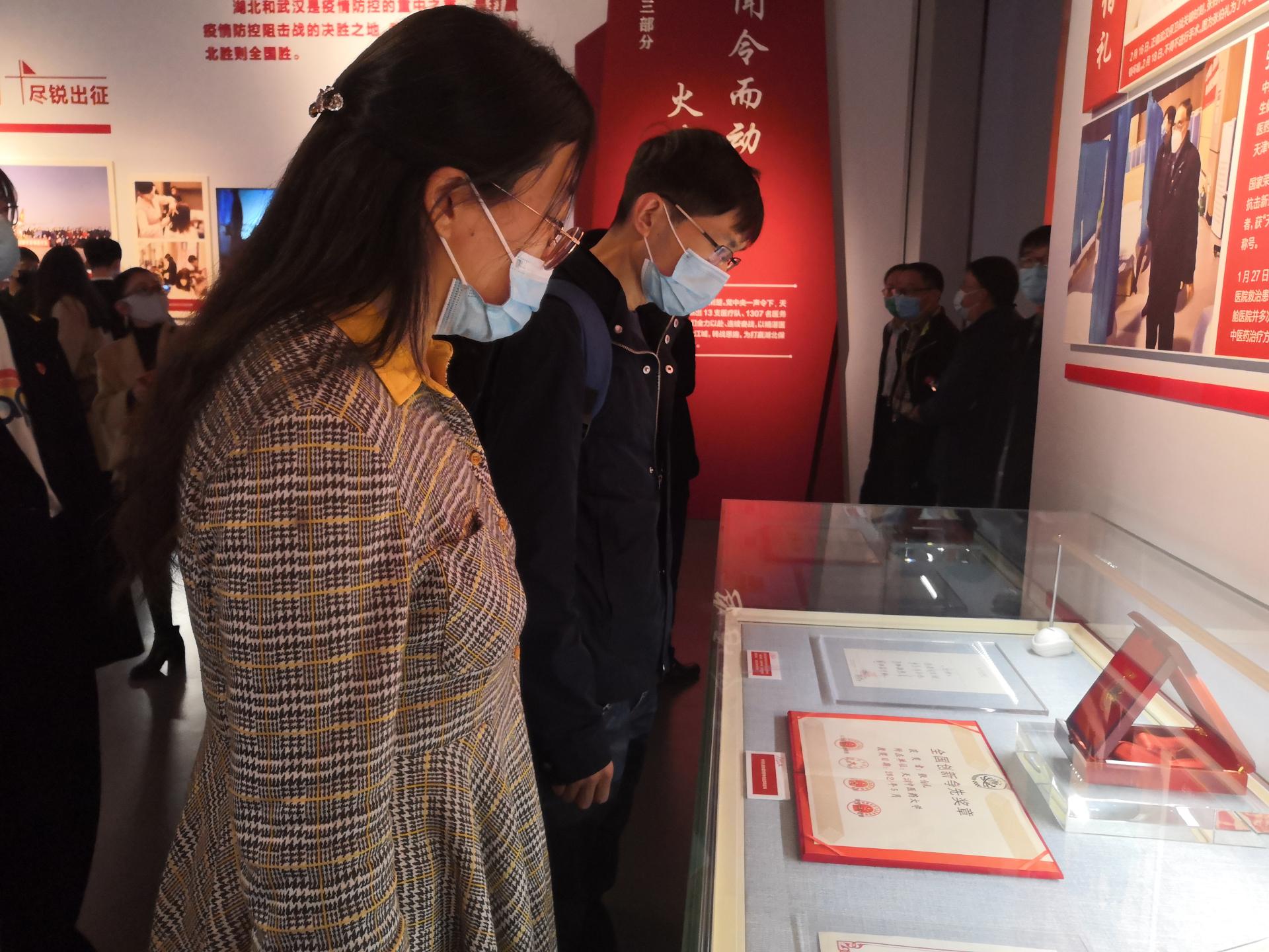 进入天津博物馆,“致敬津门战‘疫’英雄”几个大字映入眼帘,也道出了党员们的心声。