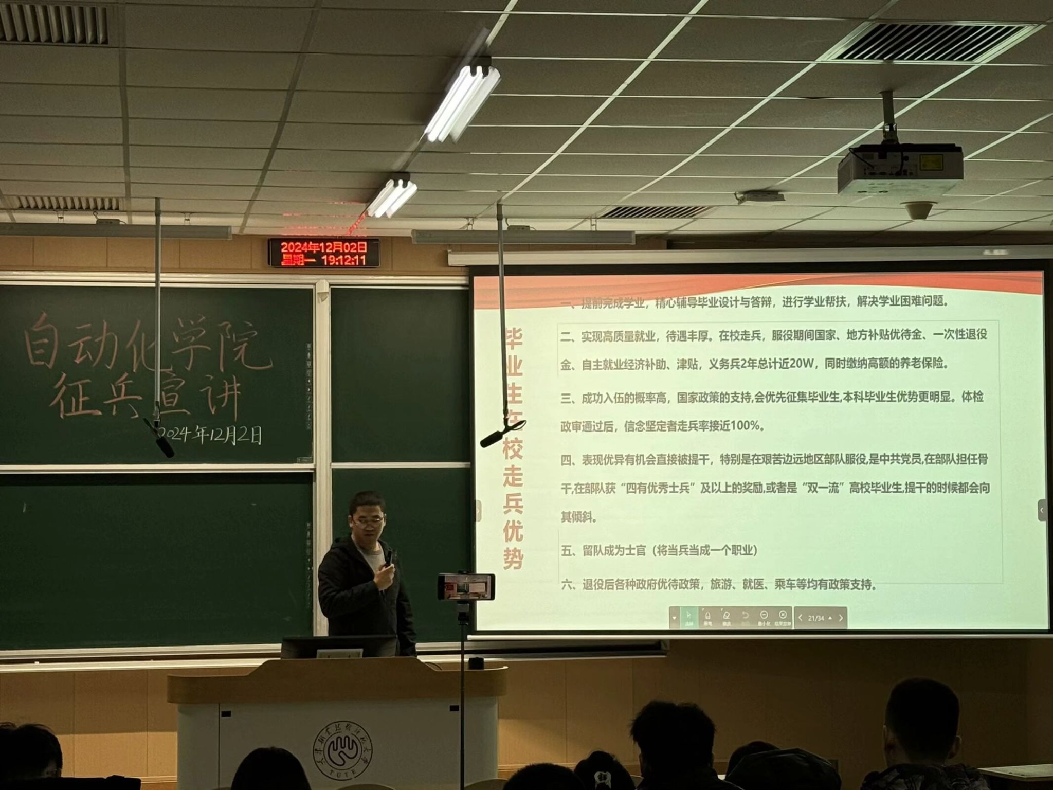 宣讲团成员电气2311饶博宇电气2315谭志鸣以讲梦想、讲故事、讲政策三个角度为切入点展开宣讲他们描绘了青年学子通过参军入伍实现个人价值、服务国家的宏大梦想,激发了现场学生对于投身军营、保家卫国的向往并向大家分享了自己在军营中的成长经历,讲述军队生活的艰辛与荣耀,传递在军营中锻炼意志、提升能力的宝贵经验最后,从入伍的基本条件、入伍的基本流程等维度,详细介绍了参军入伍的相关政策他们表示,每一位选择加入人民军队的青年,都将在军营这个大熔炉中锤炼意志、增长才干,成为国家的栋梁之才。