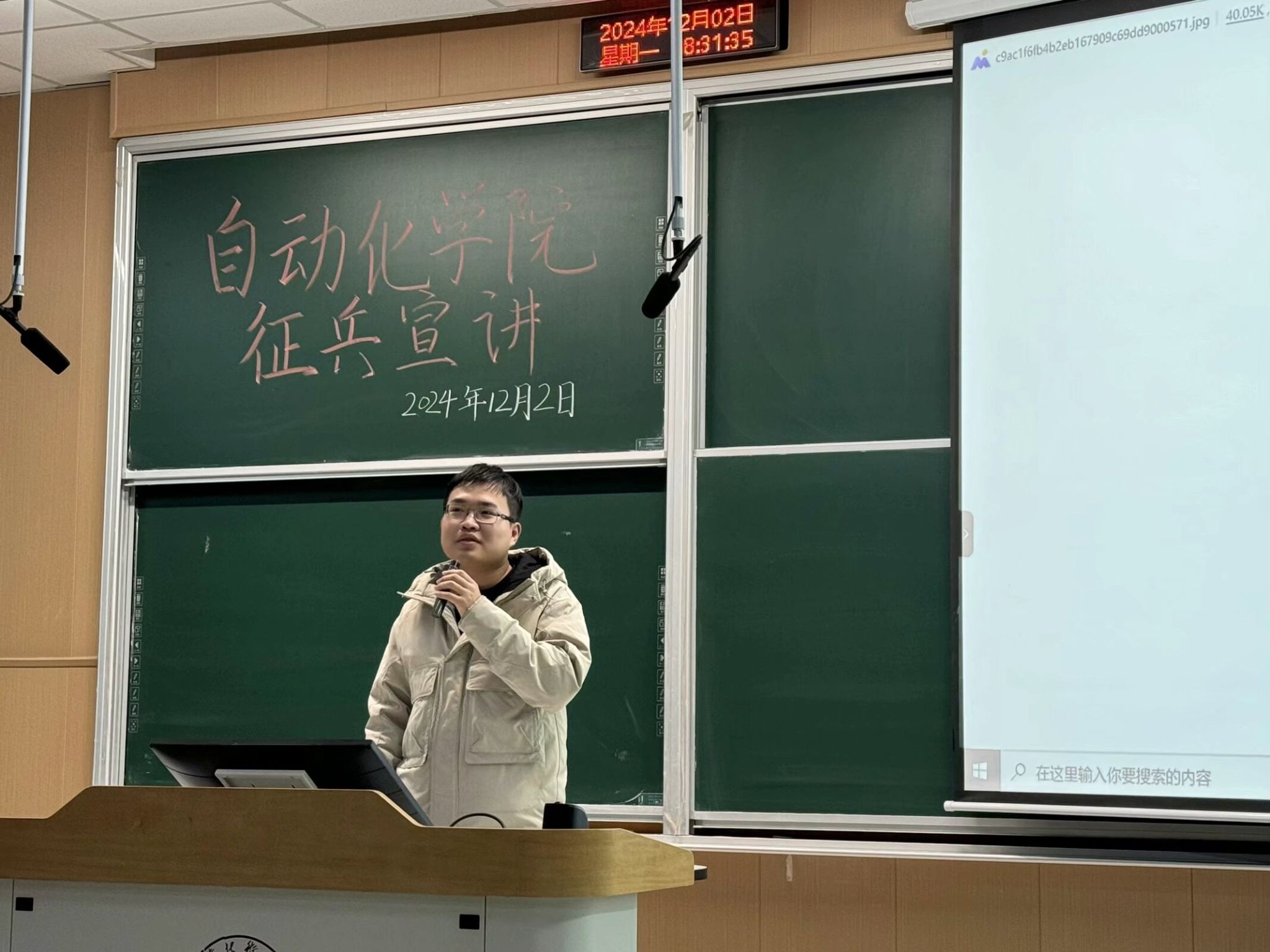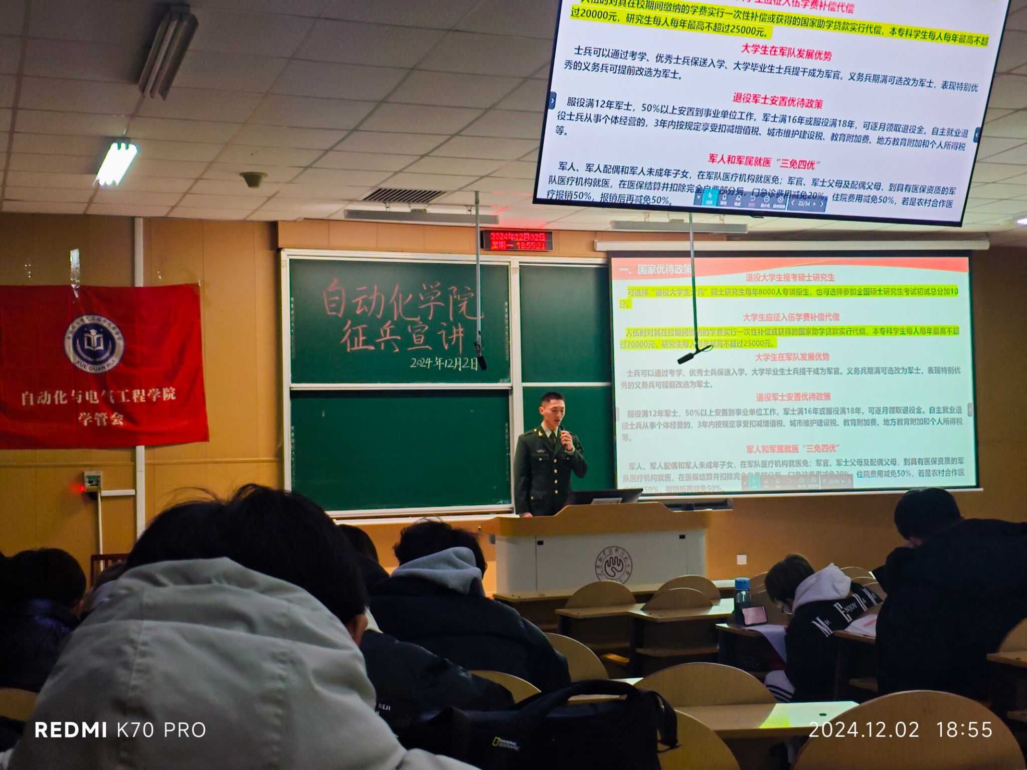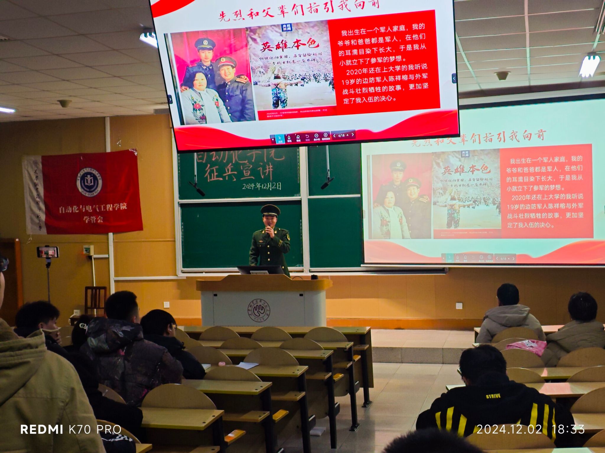 为深入贯彻落实党的二十届三中全会精神和习近平强军思想,扎实做好2025年春季大学生征兵工作,激发青年学子参军热情12月2日,禁漫 开展“热血青春,志在军营”征兵宣传系列活动。本次活动由自动化与电气工程学院学管会联合学校国防教育协会第四届征兵宣讲团共同举办,武装部朱文祥、学院团委书记兼学生工作办公室主任王超、学院辅导员安明冉出席活动。