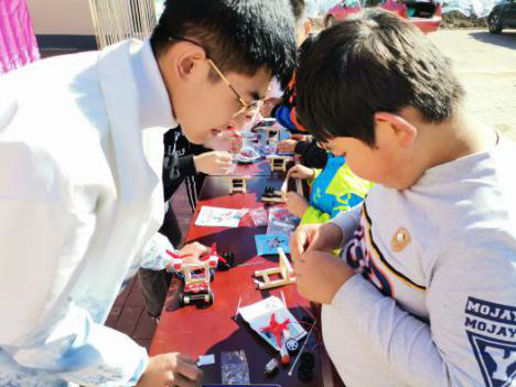 “炬芯”实践团成员组成的科普小老师们,带领参与活动的小学生熟悉微型无人机的操控,在体验中感知现代化科技的魅力。舞蹈机器人的表演激发大家极大的兴趣,老师们趁热打铁,针对机器人的定义和分类为学生们进行了讲解,引导大家逐步建立机器人的简单概念。在动手实践环节,科普老师指导学生制作风力小车。学生们在学会基本知识后,热情满满的投入到实践制作中,并通过比赛展示检验了动手动脑的成果。