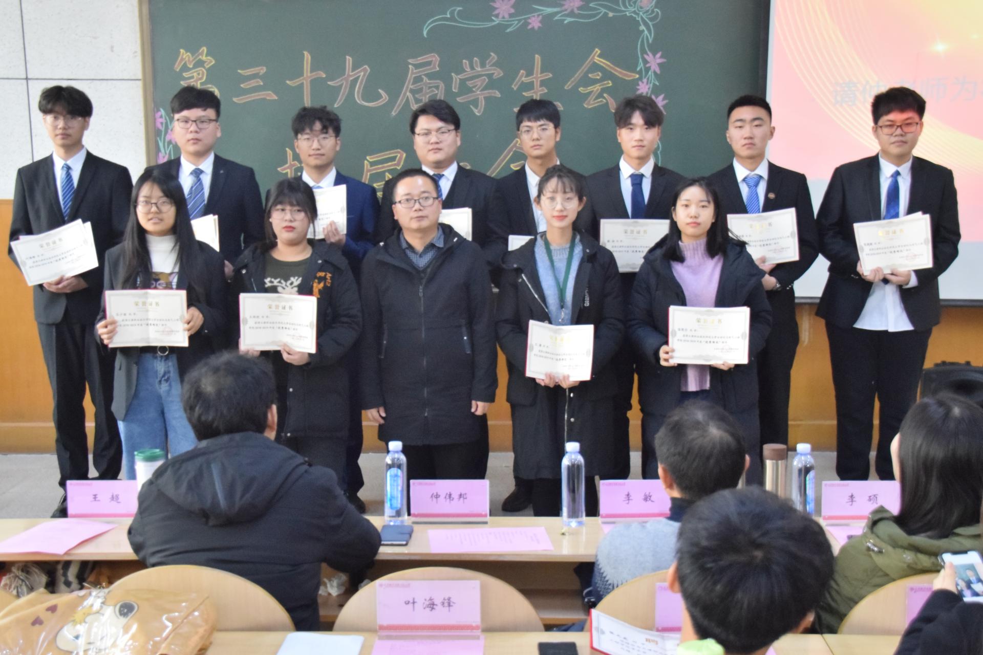 学生会换届大会在阶教101举行。学院党委副书记李敏、团委书记仲伟邦、学工办主任郭丽芳、各年级辅导员以及第38届、39届学生会全体成员参会。
