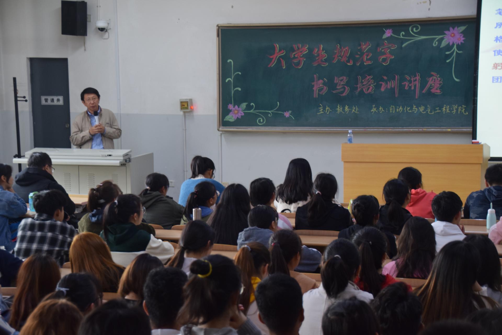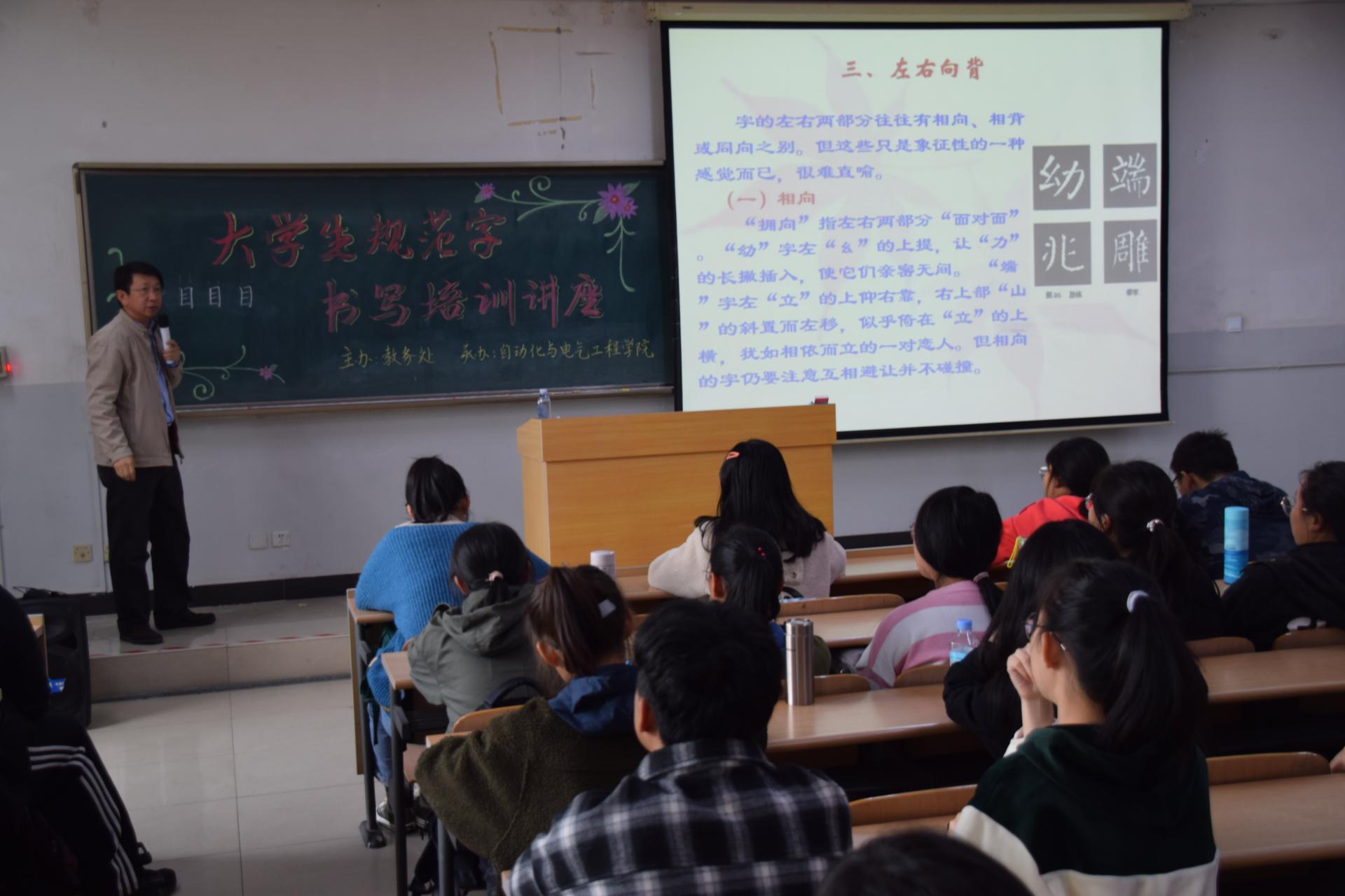 承办的“大学生钢笔、粉笔规范字书写大赛”培训讲座在第三教学楼206举行。本次培训邀请天津市书法家协会会员、我校书法课教师王旭东老师主讲,参加此次培训的是各学院选拔出来的优秀书写人才。