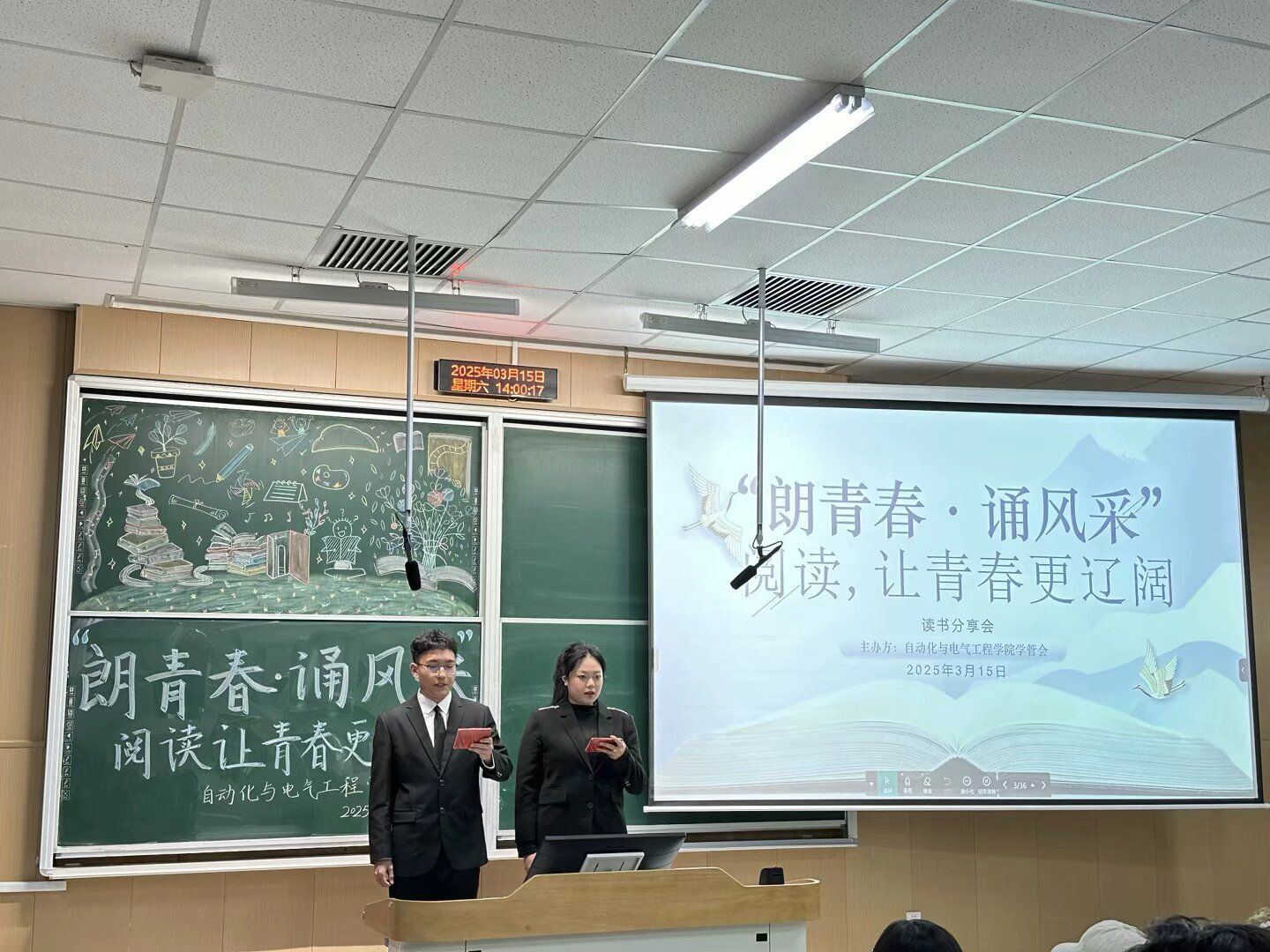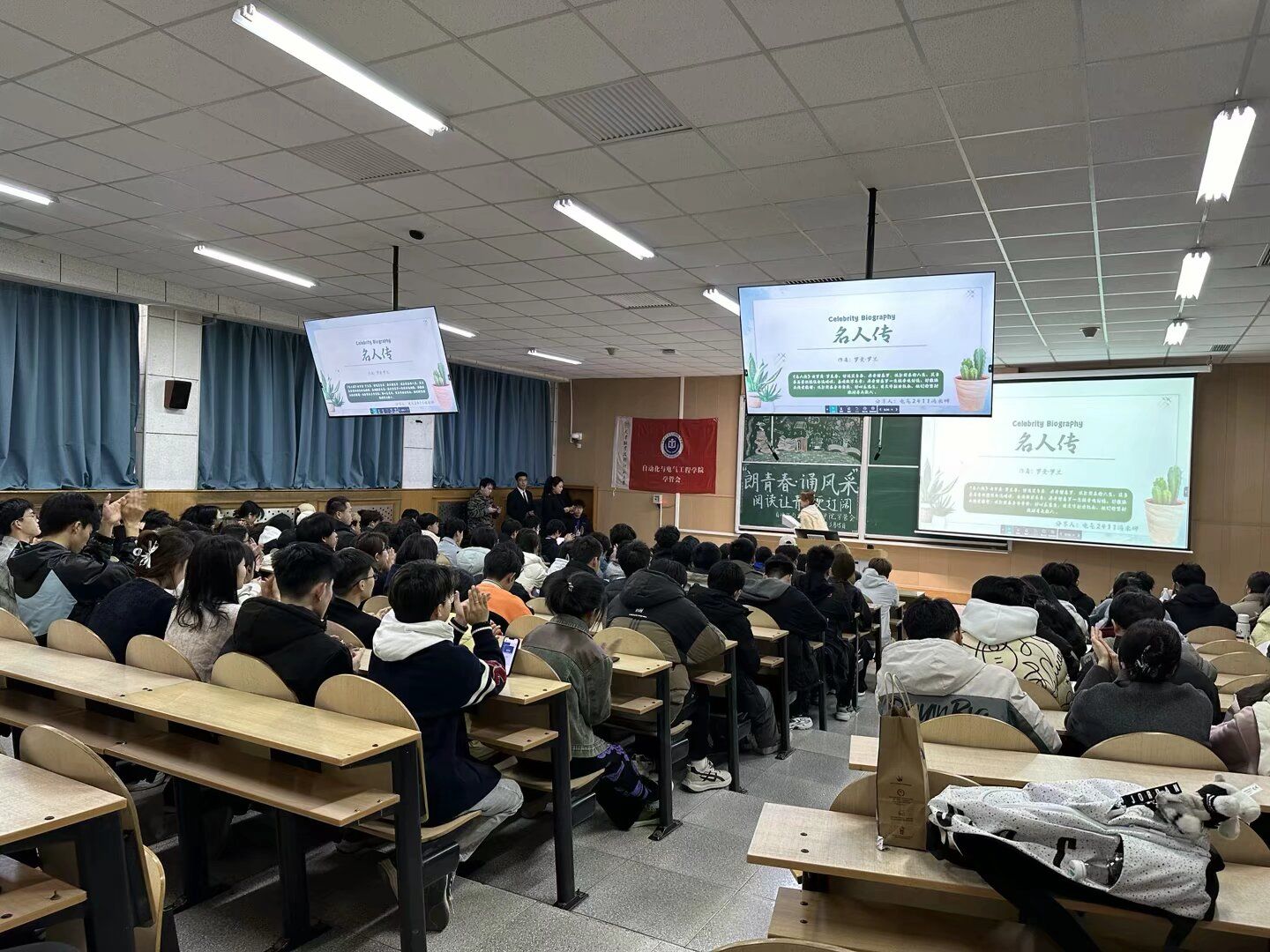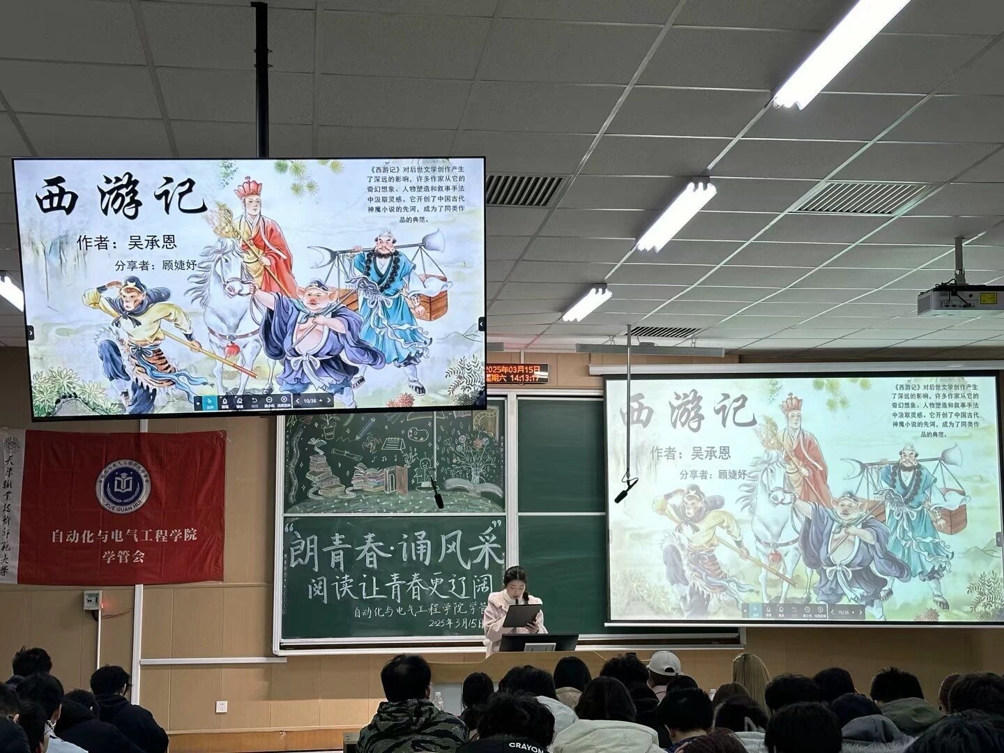 于阶梯教室102开展“朗青春,诵风采—阅读让青春更辽阔”主题读书分享活动。本次活动由学院学管会主办,通过多样化的活动形式吸引百余名青年学子到场参加,现场气氛热烈。