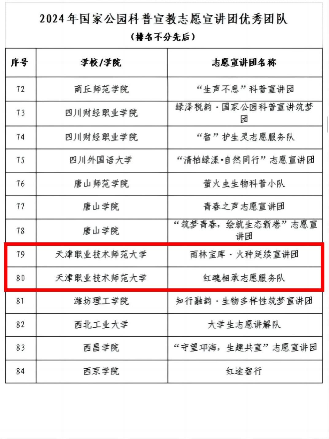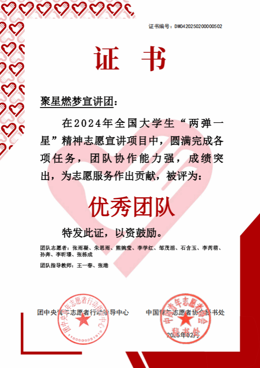 “聚星燃梦宣讲团”成功从全国870所高校的1000支团队中脱颖而出,荣获全国“两弹一星”精神志愿宣讲百个“优秀团队”称号,“雨林宝库·火种延续宣讲团”、“红魂相承志愿服务队”获2024年国家公园科普宣教志愿服务行动全国百个“优秀团队”称号。