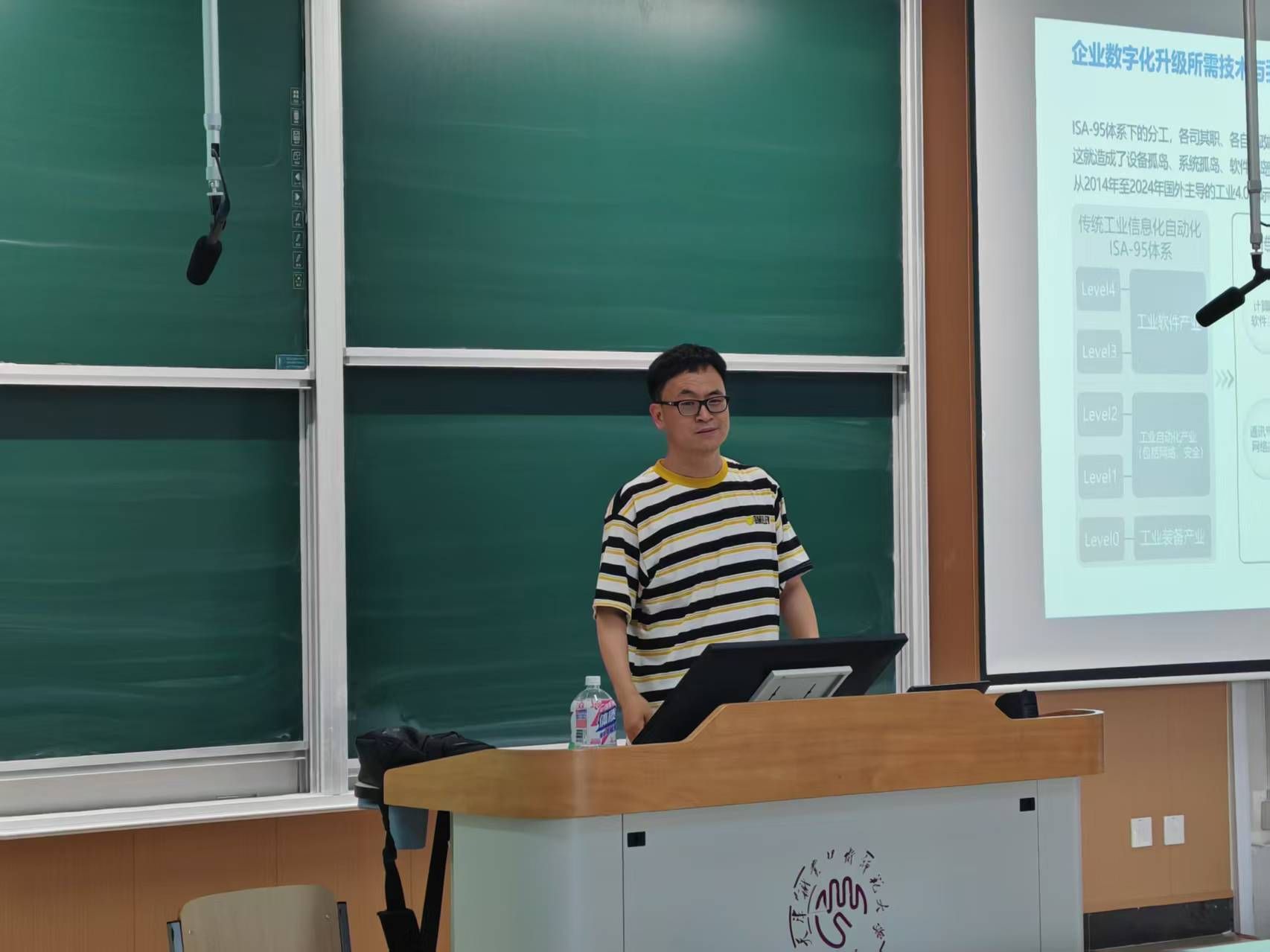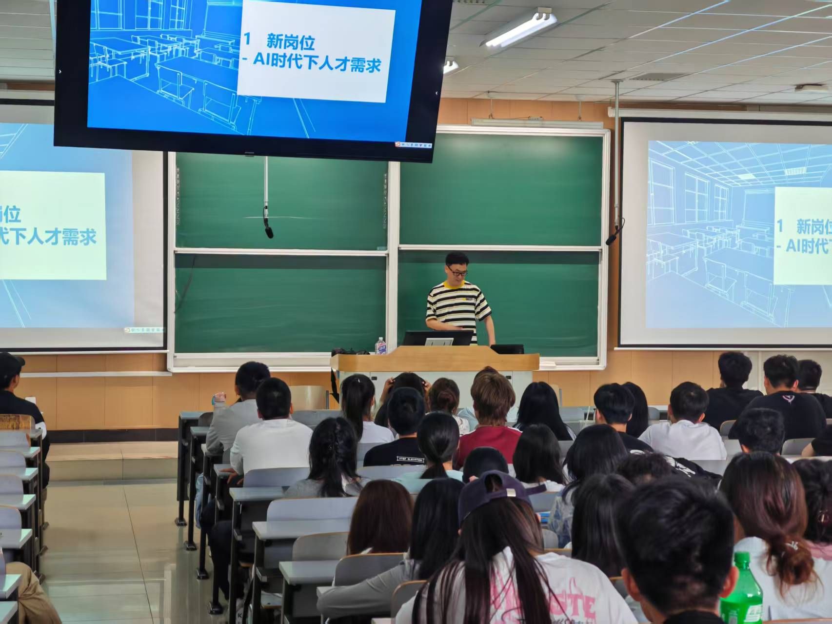 活动中,吕东结合自身职业发展历程从行业现状、职业选择、能力提升等多个维度展开分享,具体讲述了新技术AI互联网+、新课程5G+AI工业互联网、人工智能大模型、自动化控制等方面的专业知识,并展示智能园区、智能农场、智慧水务等数字化视频,迅速将同学们带入科技互联网与自动化深度融合的前沿场景。他强调,在校期间学生应注重专业知识学习与实践能力培养,鼓励学生积极参与实习、竞赛等活动,提升自身综合竞争力。